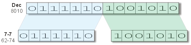A 14‑bit address (in this example 8010) can be written in binary and split into two 7‑bit groups, which gives 62 and 74, i.e. 62‑74.