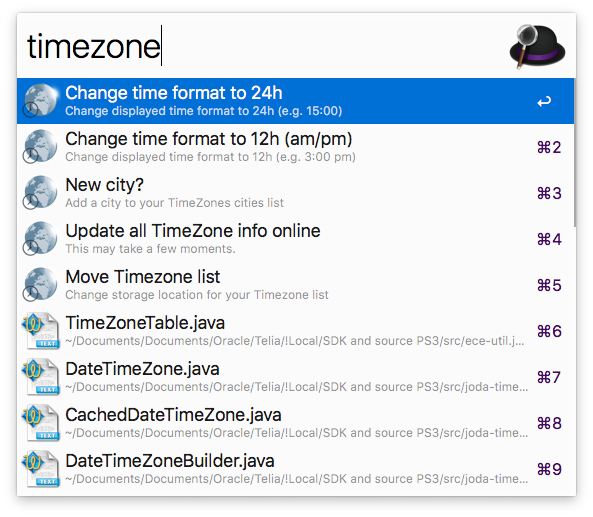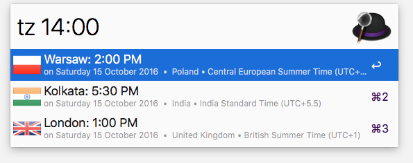 • Keywordtz (or hotkey) – bring up the list of saved cities with their respective current times. (Keep typing the name of a place for a one-off lookup.)