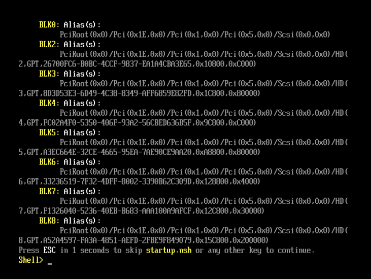 Press ESC in 1 seconds to skip startup.nsh or any other key to continue.
